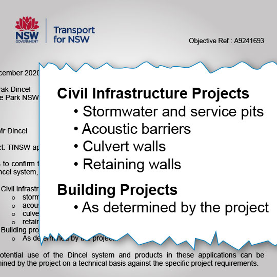 Please download the document ‘Dincel Compliance Information Sheet – Civil & Transport’ for detailed information on this topic. As Dincel is purely a formwork material, the concrete and steel reinforcement inside can be designed, ordered and placed to comply with the relevant transport concrete specifications and requirements (such as RMS B80, Vic Roads 610 and QLD Transport and Main Roads MRTS70).